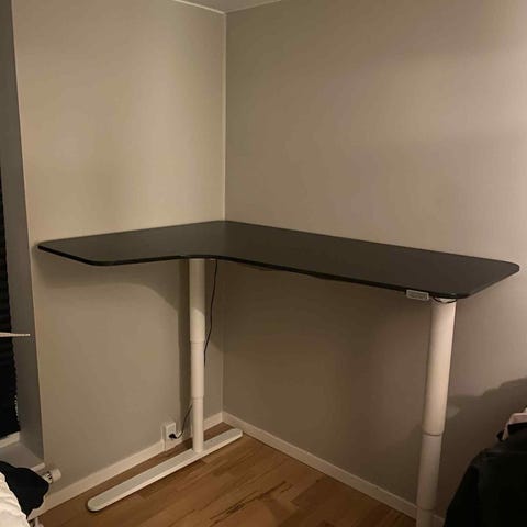 Flot og funktionelt elektrisk hæve-/sænkebord i hvid. Højde justeres nemt med knapper der sidder under bordpladen. Bordet er meget stabilt og i flot stand, fungerer 100%. Nypris 3.000,-