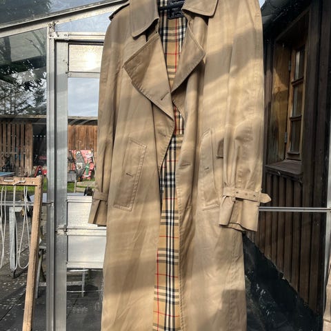 En vintage-klassiker af kvalitet fra engelske Burberry. Frakken er i fin stand med alle knapper.. Størrelsen vurderes som large. Egnet til både mænd og kvinder. Halstørklædet følger med. Der står ikke Burberry i det, men det er Lambs-wool og håndvævet og passer perfekt til frakken. Kan ses og prøves i Aarhus.