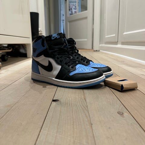 Air Jordan Sneakers i størrelse 41 med blå og sorte farver. Skoene har en klassisk design og er velegnede til daglig brug.