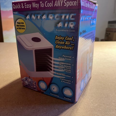 Sogo Air Cooler bærbar i hvid farve. Enheden er designet til luftkøling og har en kompakt, bærbar formfaktor. Den har et frontpanel med gitter til luftudblæsning og kontrolpanel øverst til justering af funktioner. Enheden har en strømkabel til tilslutning.