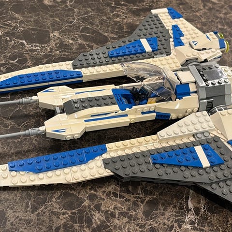 LEGO Star Wars rumskib med tilhørende figurer. Modellen er sammensat af LEGO-klodser og repræsenterer et rumskib fra Star Wars-temaet. Produktet inkluderer detaljerede elementer og to minifigurer, som kan placeres i cockpittet og ved siden af rumskibet. Mangler 2 brikker