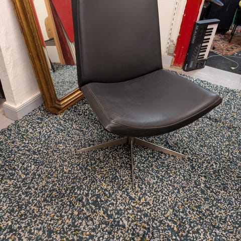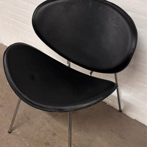 Pæn lænestol i læder. Den har en overfladisk skramme bagpå, som ses på sidste billede samt brugsspor på benene.