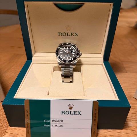 Rolex Submariner med sort urskive og stålkasse. Uret har en rustfri stålrem med foldelås. Modellen er designet til både mænd og kvinder (unisex). Leveres med original æske, garantibevis, manual og tilbehør uret er fra 2013 og fremstår i super go stand og svinger som det skal. Der er 1.5 år garant fra GD forhandler endnu uret sælges som fuld sæt