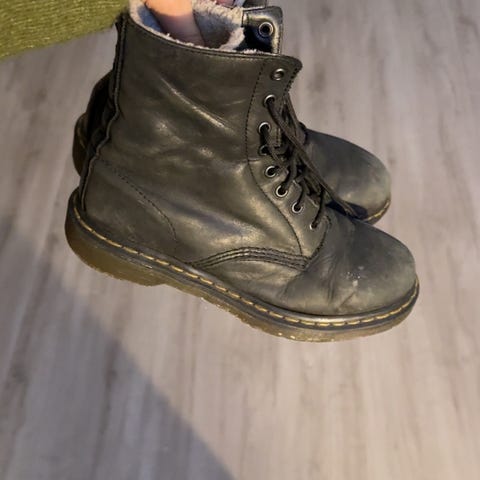 Dr. Martens støvler i størrelse 38, sort farve. Støvlerne er lavet af læder og har en foret inderside, som giver ekstra varme. Orginal sål er erstattet med en Ecco sål. Designet er uden snørebånd med elastiske sider for nem af- og påtagning.