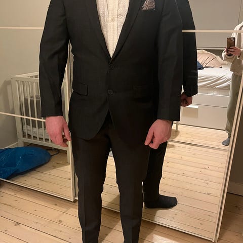 Jakkesæt str, 46, mørkeblåt, 100 % uld, brugt 1 gang, oplagt til konfirmation.