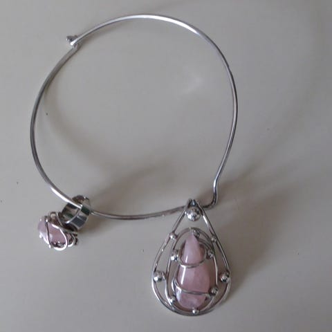 Smykkesæt til kvinde bestående af halskæde og ring fremstillet i andet materiale med indlagte halvædelsten. Sættet har et unikt og organisk design, hvor stenene er centrale elementer i smykkernes udseende. Pyrit sten