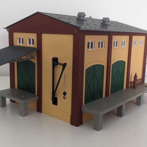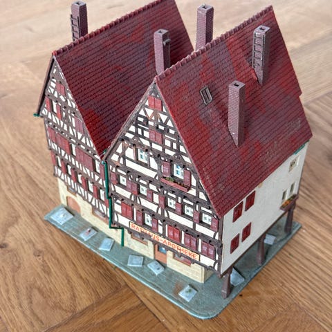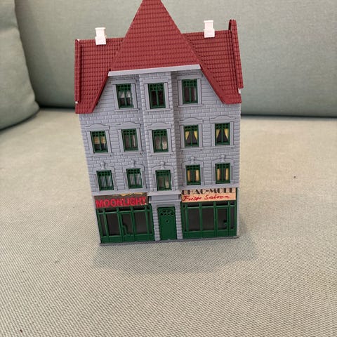 Æbeltoft Rådhus i rød og sort farve med detaljer som trapper og tag. Modellen har en firkantet form med et spidst tag og et lille tårn.