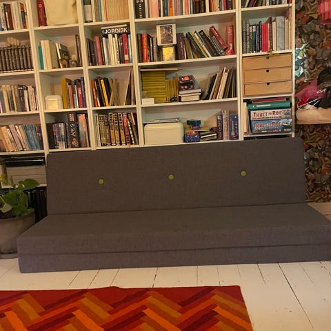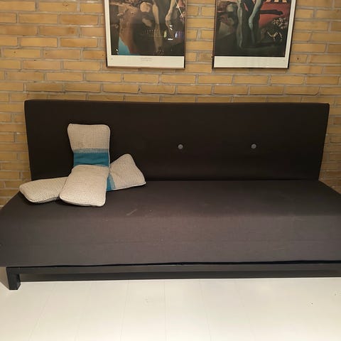 KlipKlap sovesofa i blå farve med knapper som dekorative elementer. Sofaen kan anvendes som siddeplads og omdannes til seng, hvilket gør den velegnet til både daglig brug og som gæsteseng.