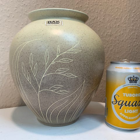 FLOT XL West germany vase fra BAY Keramik. Fin kuglevase med kort hls og bred åbning. FLOT mat glasur i brun og sand med TOP lavadecor i mat sort og blank græn. FIN samler retro,,,!! Vasen er uden skader eller skår.
