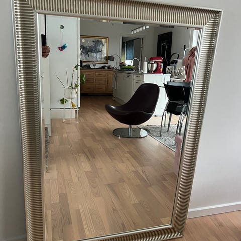 Vægspejl, b: 75 h: 110, Helt ny spejl med flot og detaljeret sølvramme.