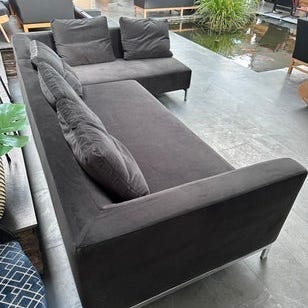 Modulsofa i mørkebrun stof af bedste kvalitet, med flere moduler.