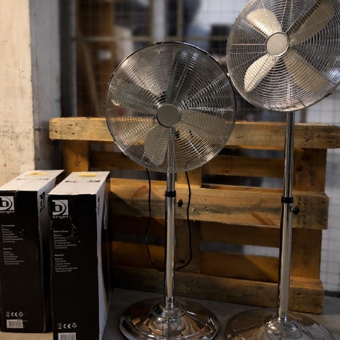 Hvid gulvventilator med justerbar højde og tre ben til stabilitet. Ventilatoren har et beskyttende gitter omkring blæserbladene og en manuel betjeningsknap til hastighedsindstilling. Velegnet til brug i hjemmet for at skabe luftcirkulation og køling.