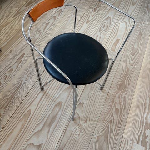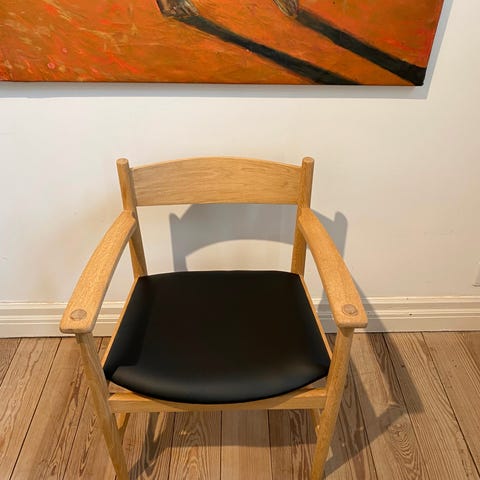 Hans J Wegner stol med brun læderpolstring og stel i metal. Stolen har et enkelt og funktionelt design, der kombinerer materialer for komfort og holdbarhed. Velegnet til brug i spisestue eller kontormiljø.
