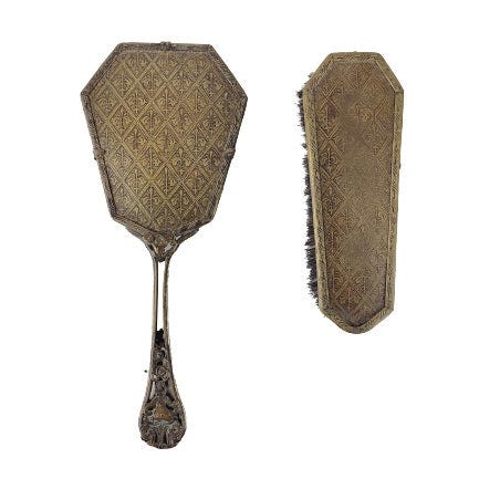 Smukt gammelt vanity-sæt bestående af håndspejl, hårbørste og klædebørste.