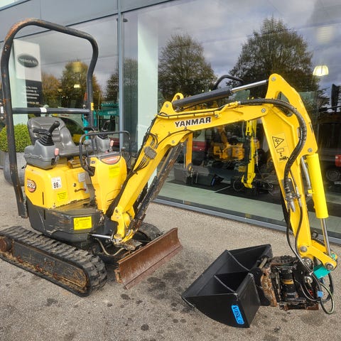 Udstyr: 2 stk. graveskovle 30 og 50 cm, 1 stk. planerskovl 100 cm, 1 stk. hydraulisk pælebor 25 cm, hydraulisk hurtigskift og med tilt.