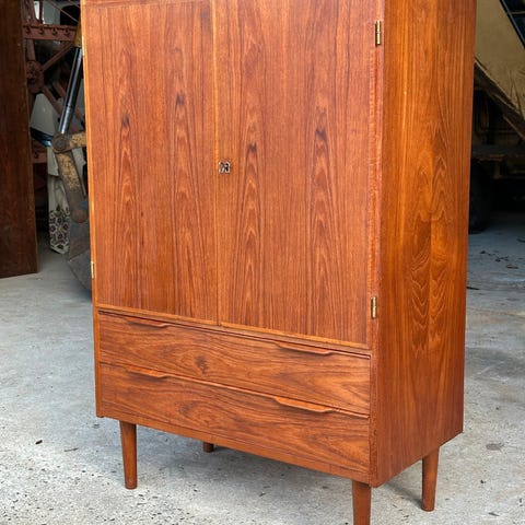 Fint skab i fineret teaktræ. Skabet er oprindeligt et gammelt symaskine skab, som nu er omdannet til barskab. Man kan vælge at holde det som traditionelt skab, men ellers kan man bruge den gamle hæve sænke funktion, hvis man vil have lidt ekstra lir. Der skal dog være en del vægt på eller lidt modvægt fra en selv, for det det ikke går for hurtigt.