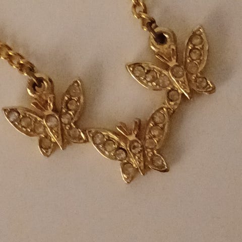 Meget yndig halskæde med små hvide perler og en lille sommerfugl med klare sten. Kæden er 40 cm + 7 cm forlængerkæde. Derudover er vedhænget med sommerfugl og perler 4 cm. Smykket er forgyldt og perlerne er ikke ægte - derfor den lave pris.