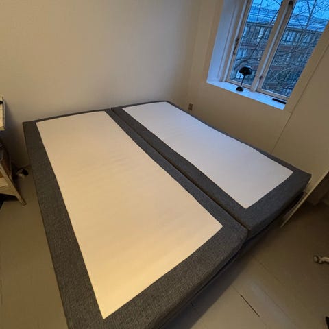 Jysk elevationsseng med lamelbund og madras. Sengen har en ramme med lamelbund, og to separate madrasser i lys farve. Sengen er designet til standard enkeltsengsstørrelse og er egnet til voksne