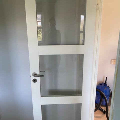 Hvid dør med 12 glasfelter i ramme og hvide porcelænshåndtag. Døren har beslag til hængsler. Døren er velegnet til indvendig brug.