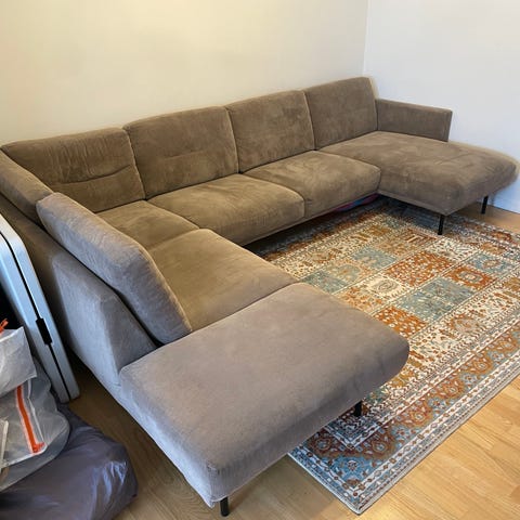 Larvik højrevendt hjørnesofa med chaiselong fra Ilva i “wave 70 sand stof”.