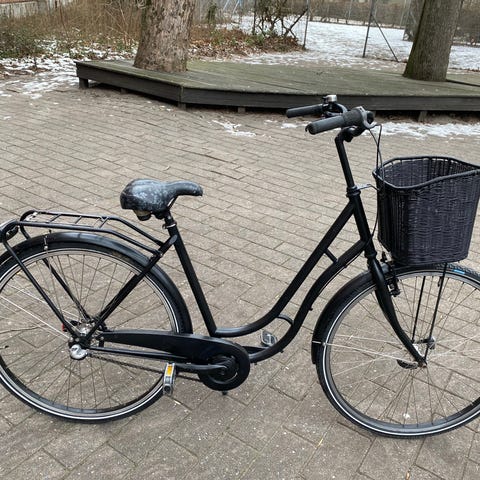 Cyklen er endvidere udstyret med Shimano Nexus håndgear, Alhongs håndbremse på forhjul, bagagebærer bagpå og bast cykelkurv foran, samt forsikringsgodkendt lås med nøgle.