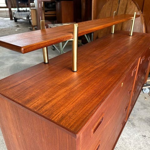 Et par på to pæne teaktræshylder med ophæng. Står med kun små aldersrelaterede brugsspor. Måler B: