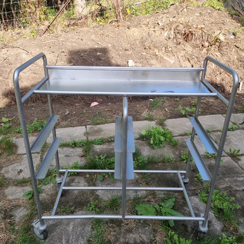 Rustfri stål rullebord med 3 hylder. Mål på hylderne er cirka 80 cm i længden og 50 cm i bredden. Bordet har hjul og håndtag for nem transport og opbevaring. Velegnet til brug i køkkener, værksteder eller andre miljøer, hvor holdbarhed og mobilitet er nødvendige.
