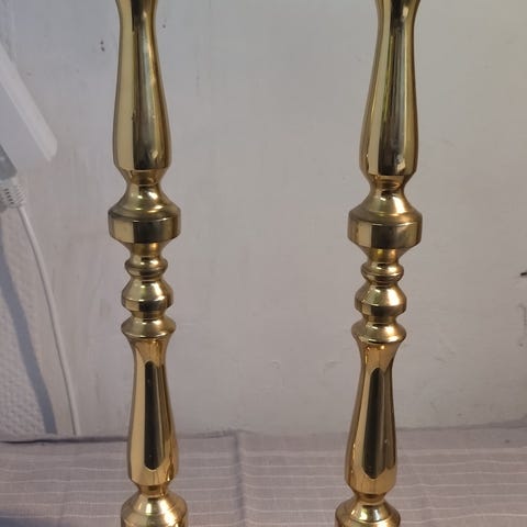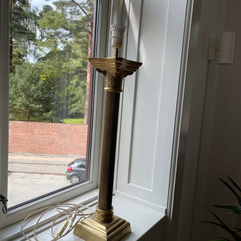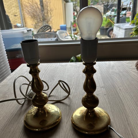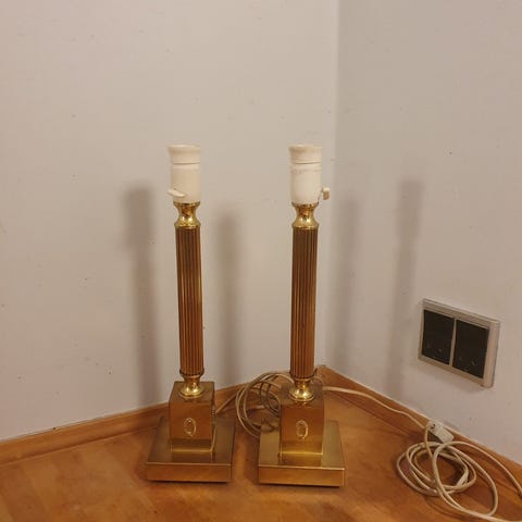 2 stk store smukke og unikke lamper i messing. Perfekte til en stor vindues karm eller til gulvet. Ingen skader på dem. Højde 72 cm til fatning. Skærme medfølger ikke. Sælges helst samlet.