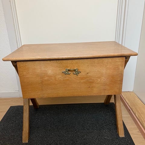 Vintage, retro sofabord, bord med skuffe med rumopdeling og kurv til opbevaring.