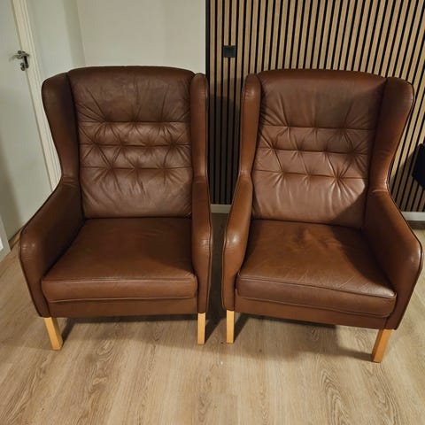 Fed øreklapstol i sort læder inkl. puf.