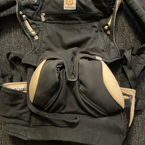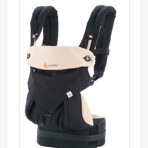 Ergobaby 360 bæresele i sort og camel / beige farve. Brugt til vores to børn, fungeret perfekt og gør det stadig. Justerbare og polstrede stropper og bæltetilpasning med velcro.