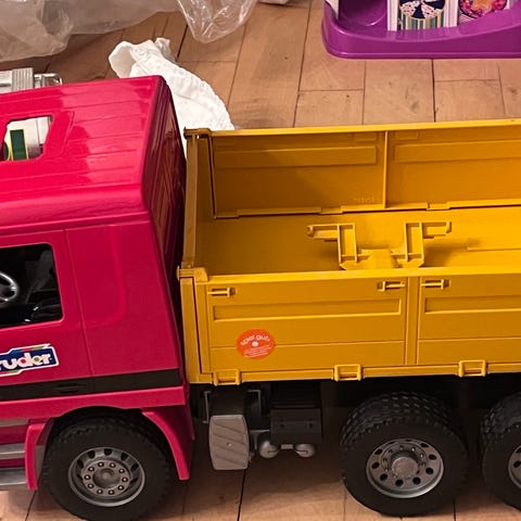 Bruder MAN lastbil med kran og tømmer. Lastbilen er grøn med en rød kran og har plads til at transportere tømmer. Velegnet til leg med fokus på lastbil og skovbrug.