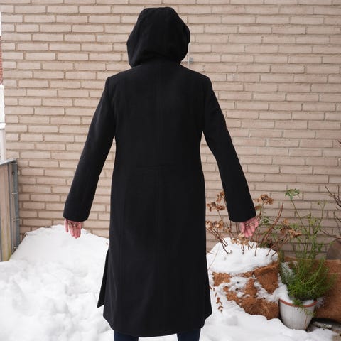 Lækker jakke fra Hettemarks, model Amica, i uld og cashmere kvalitet. Jakken har kontrastfarvet kanter, slids i siderne og både hætten og pelskanten kan tages af. Den er kun brugt nogle få gange og ser ud som ny.