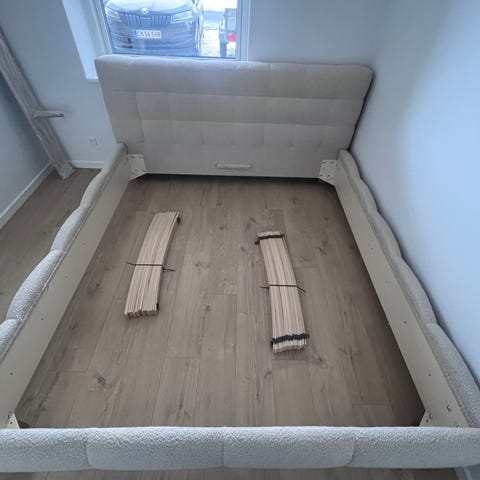 Mollis seng fra Bedre Nætter med polstret hovedgærde og beige betræk. Sengen har en lys farve og et blødt tekstilmateriale, der dækker både ramme og hovedgærde. Sælges da vi vi ikke har plads til den længere.