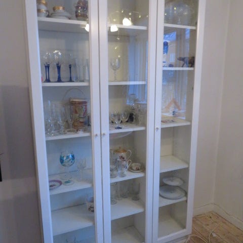 Hvidt vitrineskab, fremstår uden større brugsspor.