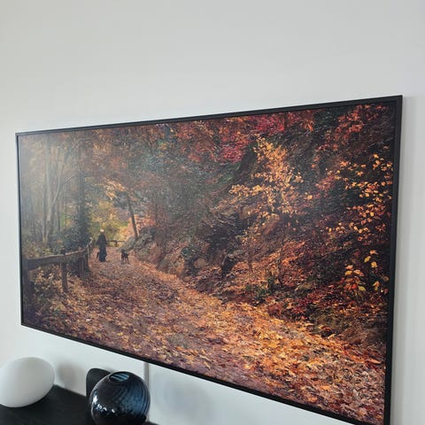 Samsung The Frame 32" sælges. Det smarte ved den her model er, at den ligner et billede på væggen, når den er slukket.