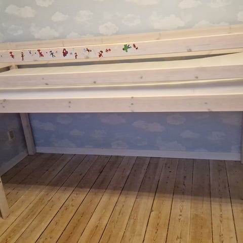 Højseng til børn i hvidt træ. Vores børn har tegnet på sengen, så en gang maling ville hjælpe. Til gengæld kan den afhentes ganske gratis. Er adskilt
