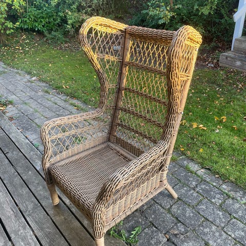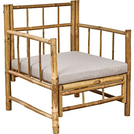 Dejlig bambus lænestol til altan eller terrasse. Fletstol med tilhørende fodskammel fremstillet i naturfarvet rattan. I ok stand men er blevet farvet i solen. Købt i Ilva.