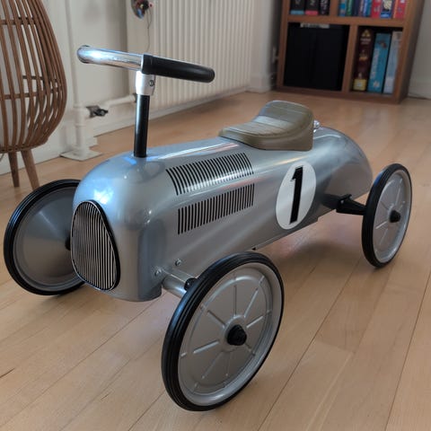 Fik Goki gåbil. Det ene 1-tal er sluppet lidt men det er forsigtigt sat på med tape. Der er en enkelt let rusten skrue i rattet men ellers intet at udsætte på denne fine gåbil! Nypris 1.230 kr.