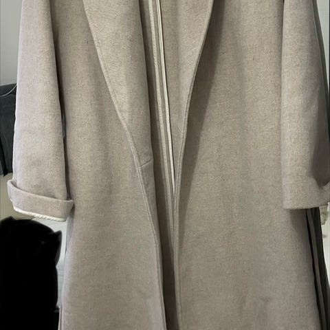 Lang elegant frakke i uld og polyester. Frakken har bindebånd og lækkert for i polyester. Der er lommer i siderne og en inderlomme. Har brugt den få gange, men får den ikke brugt, da den er lidt for lang til mig, da jeg cykler hver dag. Meget flot over festtøjet eller en elegant hverdag. Ny pris 2500