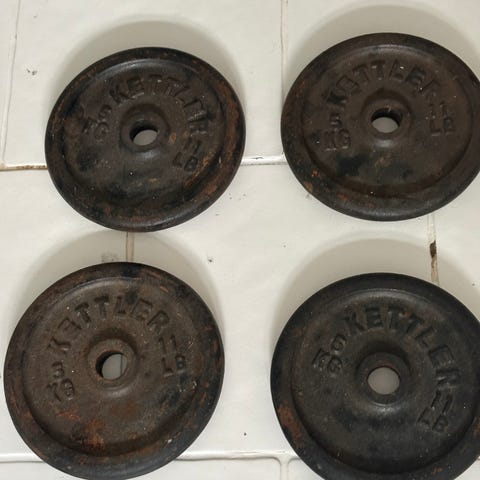 Kettlebell 2x6kg, 2 gange 2,5 kg håndvægt og 1 kg håndvægt