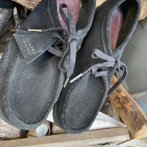 Jeg sælger disse sorte Clarks i str. 42,5. De har et lille hul i sålen, som vist på billedet, men ikke et hul som er synligt når de bruges, hvilket fremgår af det sidste billede.