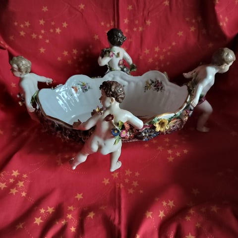 Antik Tysk Elfinware LÅSEKASSE /pudderdåse med håndlavet porcelænsblomster og broncemontering.