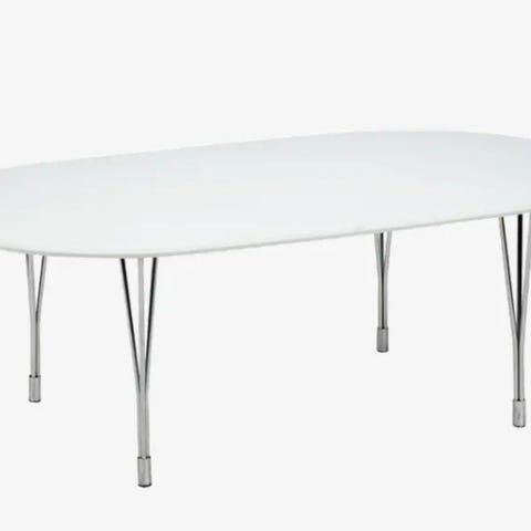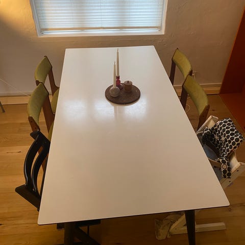 Et hvidt spisebord 200x100cm med lyse ben. Der medfølger 2 tillægslader på 45cm stykket. Bordet har er godt og solidt. Der er desværre lidt mærker hist og her. Stolene følger ikke med men kan tilkøbes for 100 kr stykket eller alle 6 for 500