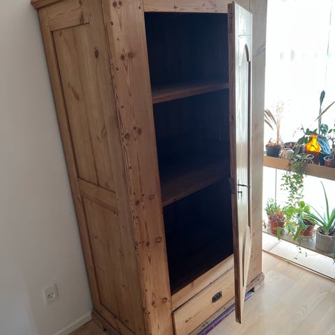 Ældre karlekammerskab med tre hylder og skuffe. Malet i gammelrosa. Brugt som tøjskab på børneværelse. Brugsspor, men fejler intet. Mål: H189 x B93 x D55. Afhentes i Malling ved Aarhus.