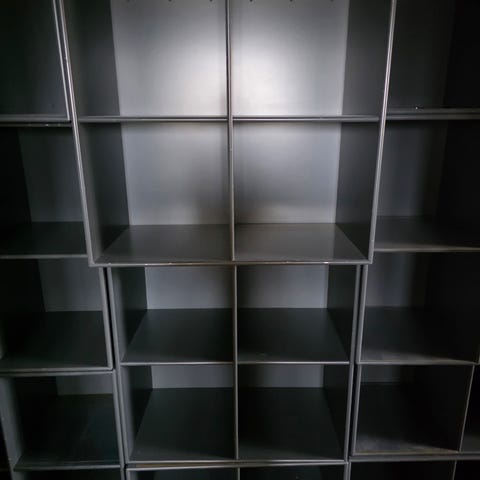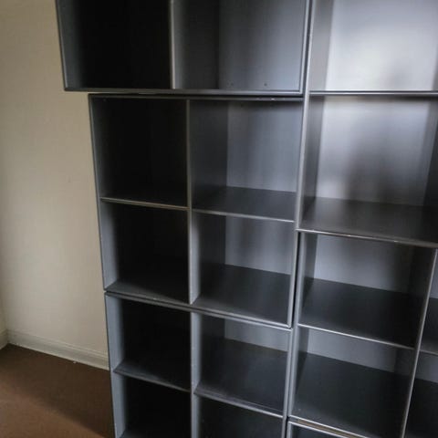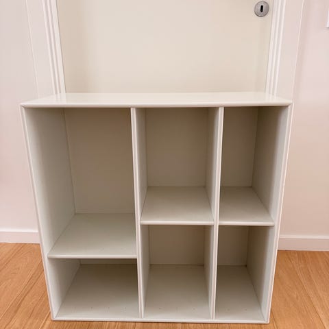 Åbne reoler eller med skuffer eller låger. Evt farvede detaljer.