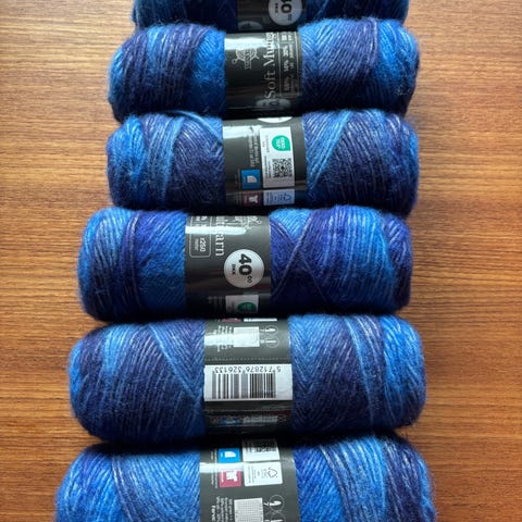 Yarn & Friends Soft multigarn. Købt i netto. 100 g pr nøgle = ca 250 meter. Flerfarvet solnedgangsmønster i nuancer af lilla, orange og gul. Garnet består af 14% uld, 56% polyacryl og 30% polyamid.