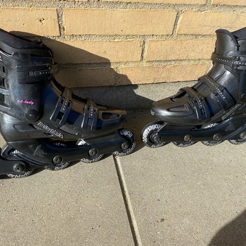 Næsten ny rulleskøjter til børn i størrelse 36-40 med sort og lilla farve. Skøjterne har justerbar lukning med spænder og er designet til rulleskøjteløb.
