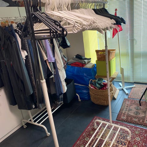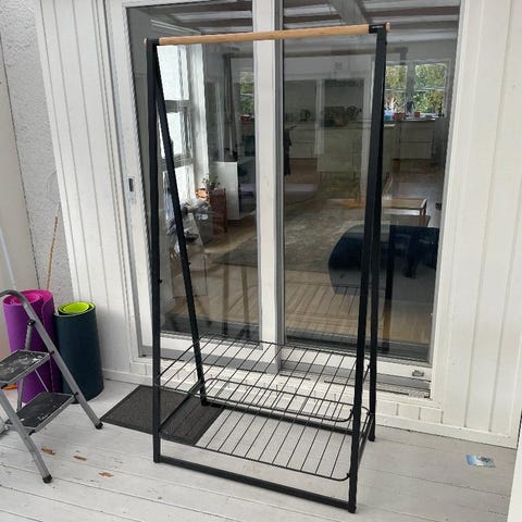 Sødt lyserødt tøjstativ med skokasse. Rigtig hyggeligt på et pigeværelse, hvor hun selv kan vælge sine kjoler.