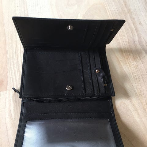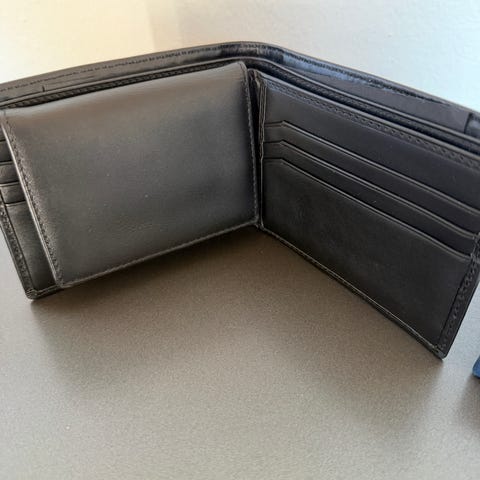 Zara sort læder pung til mand med flere rum til kort og ID. Pungen er designet til at opbevare mange kreditkort, ID-kort og kontanter på en organiseret måde.